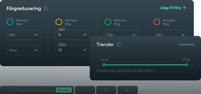 Streckfördelningen visar hur alla rader som har lämnats in har fördelat sig men det är svårt att veta hur det har rört sig under dagen - tack vare verktyget “trender” är det nu möjligt. Ställ in ett tidsintervall och få information kring hur mycket som har omsatts, hur strecken har rört sig under den givna tiden och vilka lag som trendar uppåt.