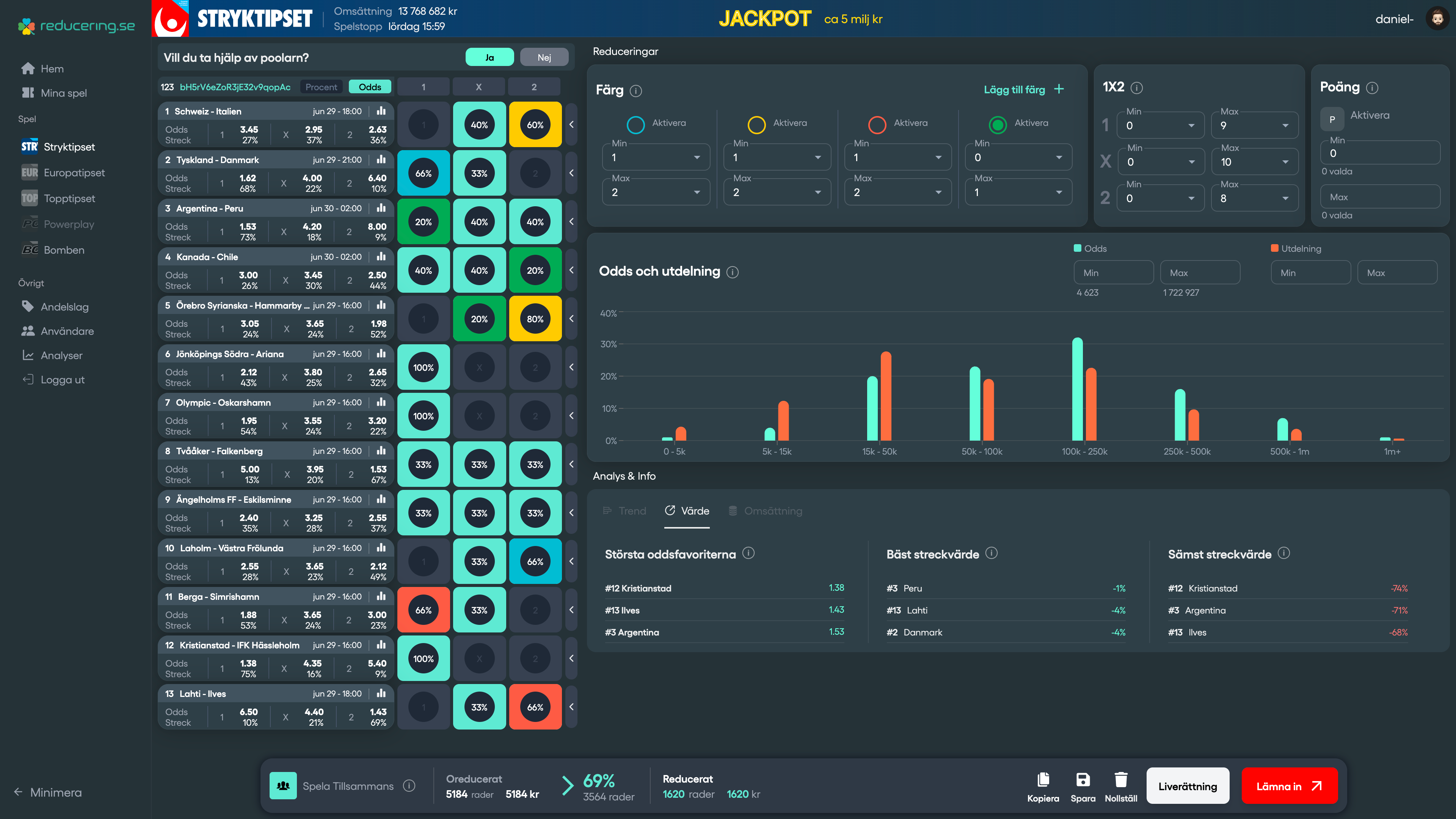 Reducering.se är det ledande reduceringsverktyget för Svenska Spel Sport och Casinos poolspelsprodukter, framtaget av ett team med lång erfarenhet av poolspel och att spela reducerat.