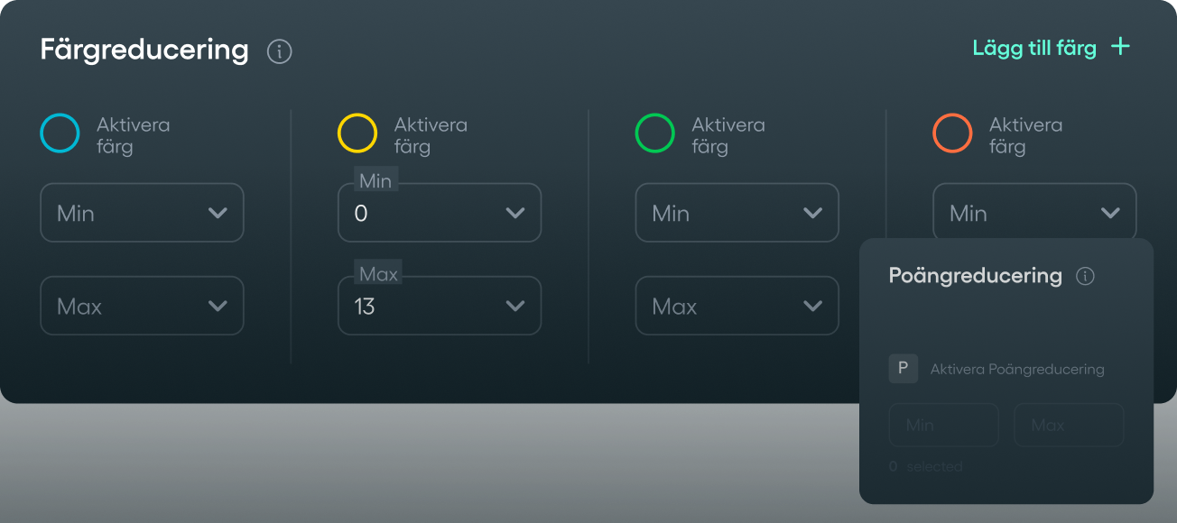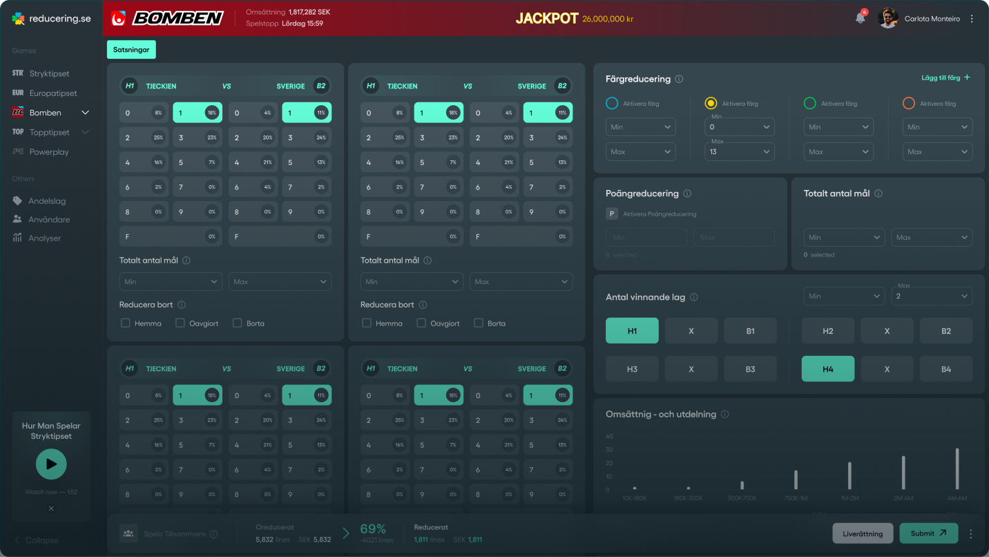 Använd färg-, poängreducering eller ta bort x antal slutresultat från ditt system. Titta igenom utdelningsprognosen för att få en överblick av systemet och korrigera med nya reduceringar om du inte känner dig nöjd. Den stora fördelen med reducering på Bomben är flexibiliteten, på ett vanligt matematiskt system kan du inte bygga ditt system med samma kontroll. Börja reducera på Bomben idag och skaffa dig en fördel gentemot spelarpoolen.